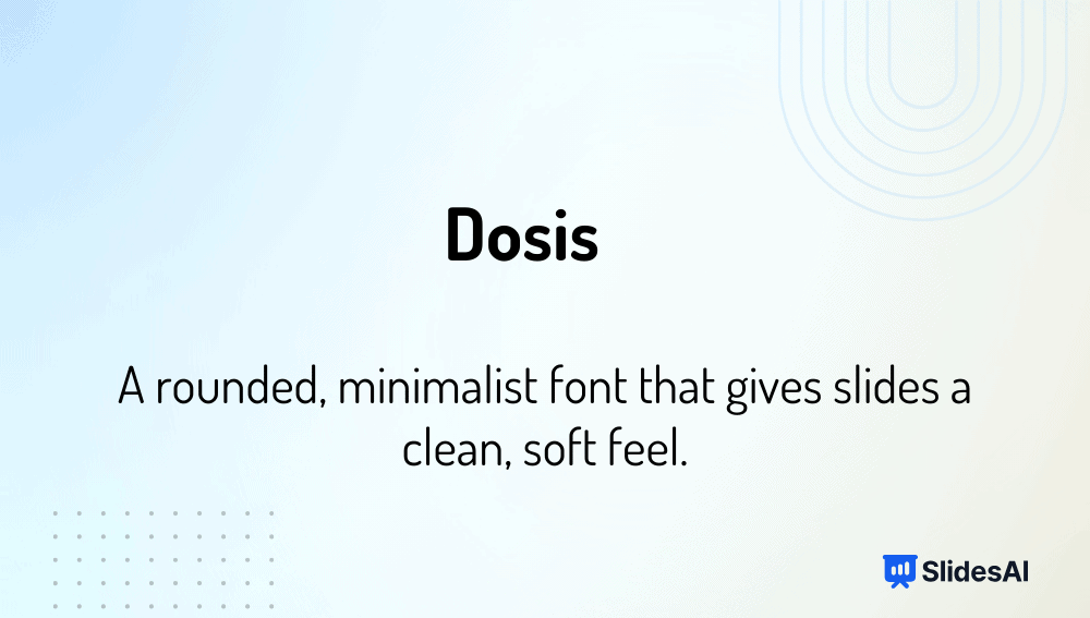 | Dosis | Sans-serif (Variable) | 1 | 59 | Rounded, minimalist sans; open-source. known for its rounded corners and geometric design. The style is warm and approachable, which makes it a favorite in creative projects |