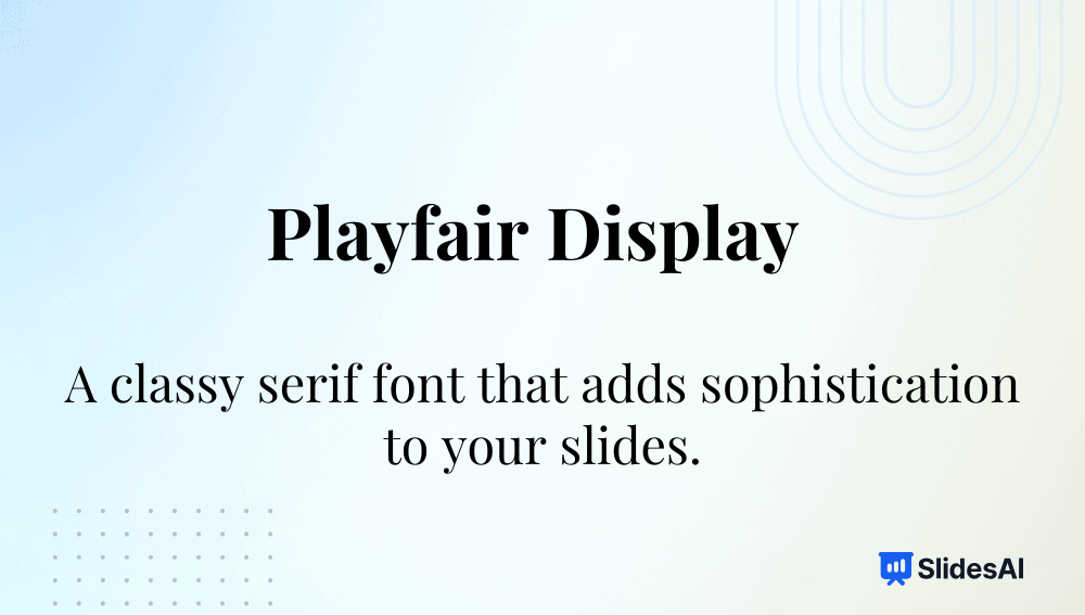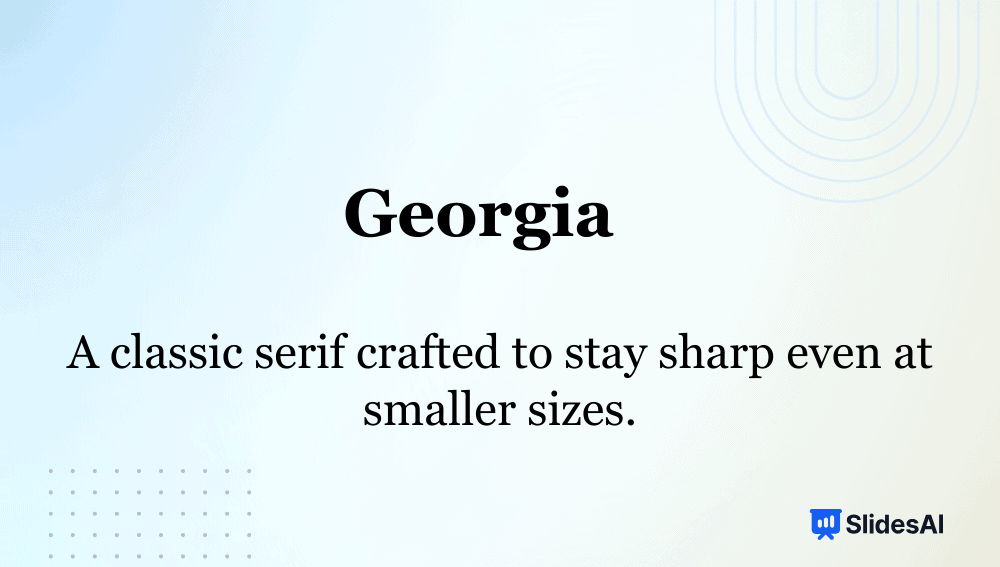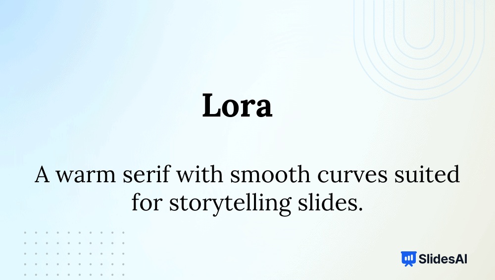- Serif fonts such as Georgia and Lora add elegance and professionalism to formal decks.