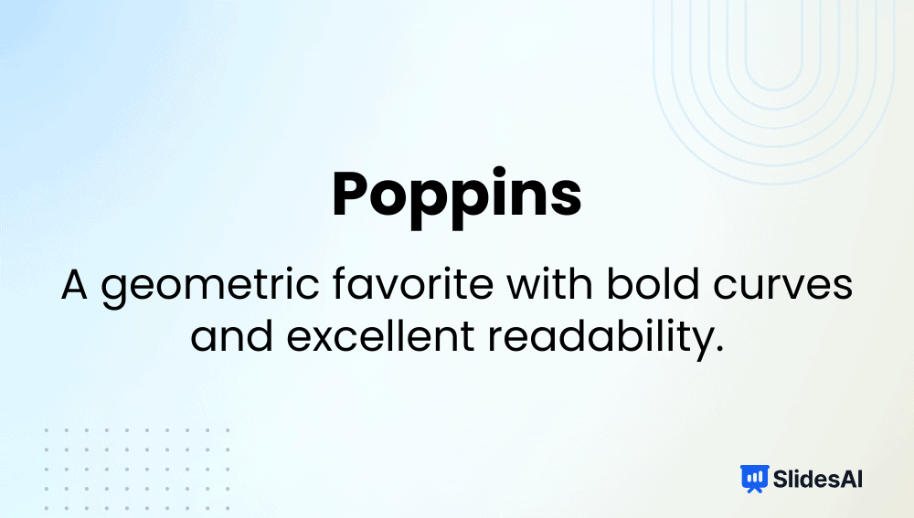 | Poppins | Sans-serif | 20 | 57 | It is a geometric sans serif font, with influences from both humanist and grotesque typefaces. Its design features include slightly rounded corners, a tall x-height, and an open aperture. The font is known for its legibility and versatility, making it suitable for a wide range of projects. |