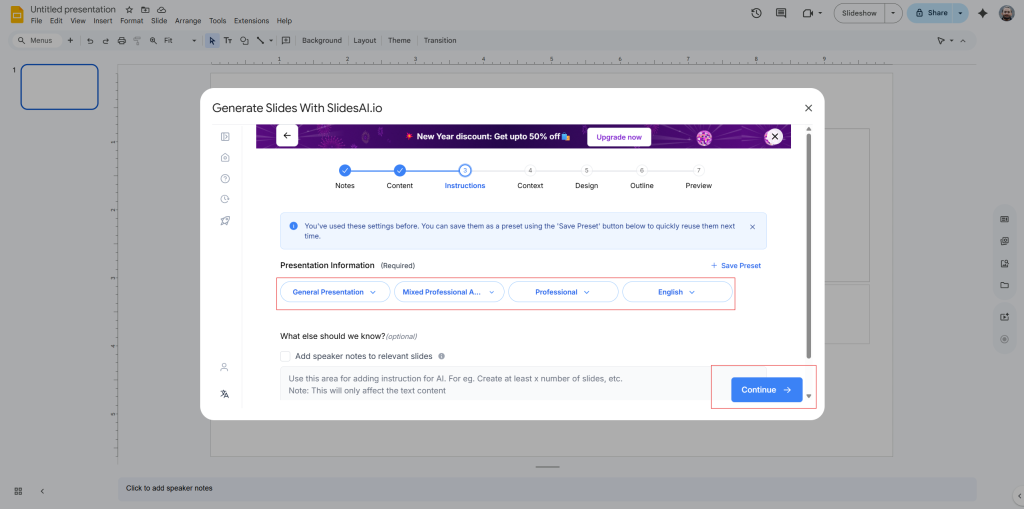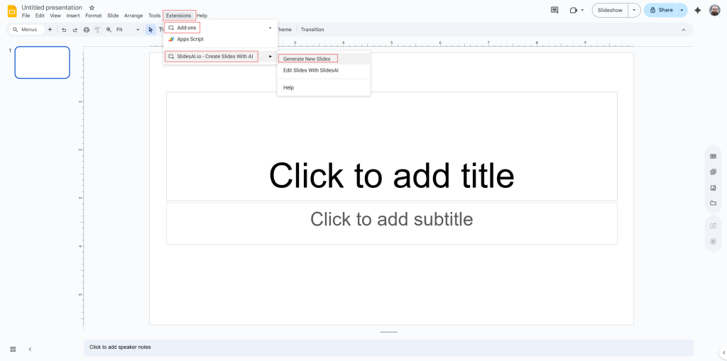 Step 2: Open your Google Slides. Then go to Add-ons > SlidesAI.io > Generate new Slides.