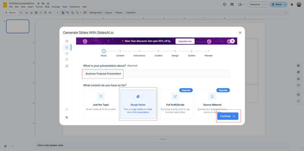 Step 3: When prompted, enter your topic. In this case, type “Business Proposal Presentation” and choose the “Rough Notes” option.
