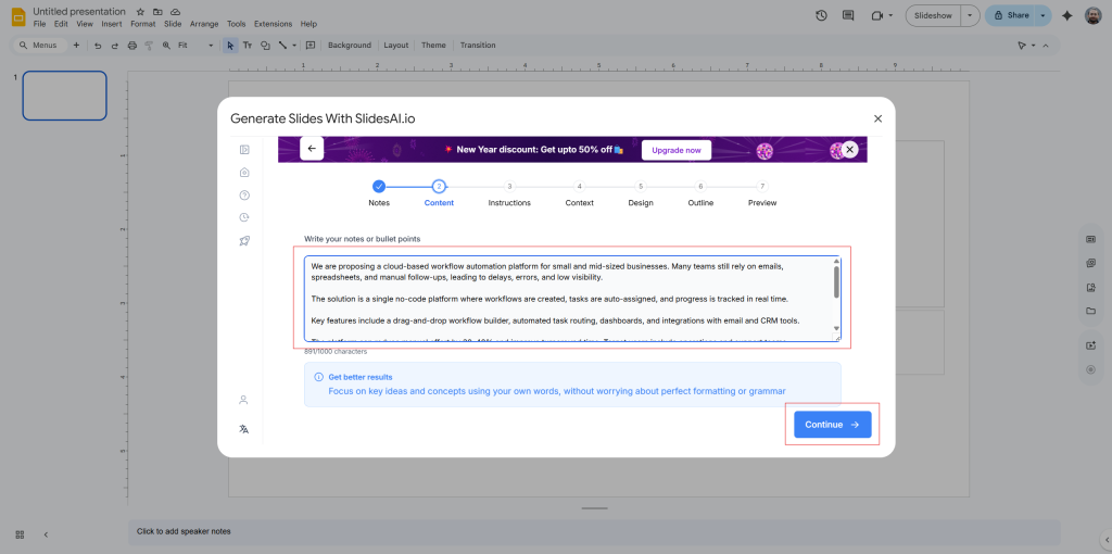 If you’re short on time or not confident with design, SlidesAI can help you turn your ideas into a professional-looking business proposal in minutes. Here’s how to do it: