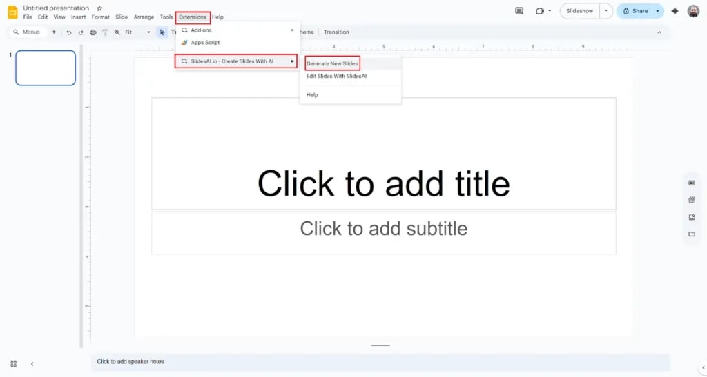 Step 2: Once installed, open SlidesAI from the Extensions menu and select Generate New Slides.