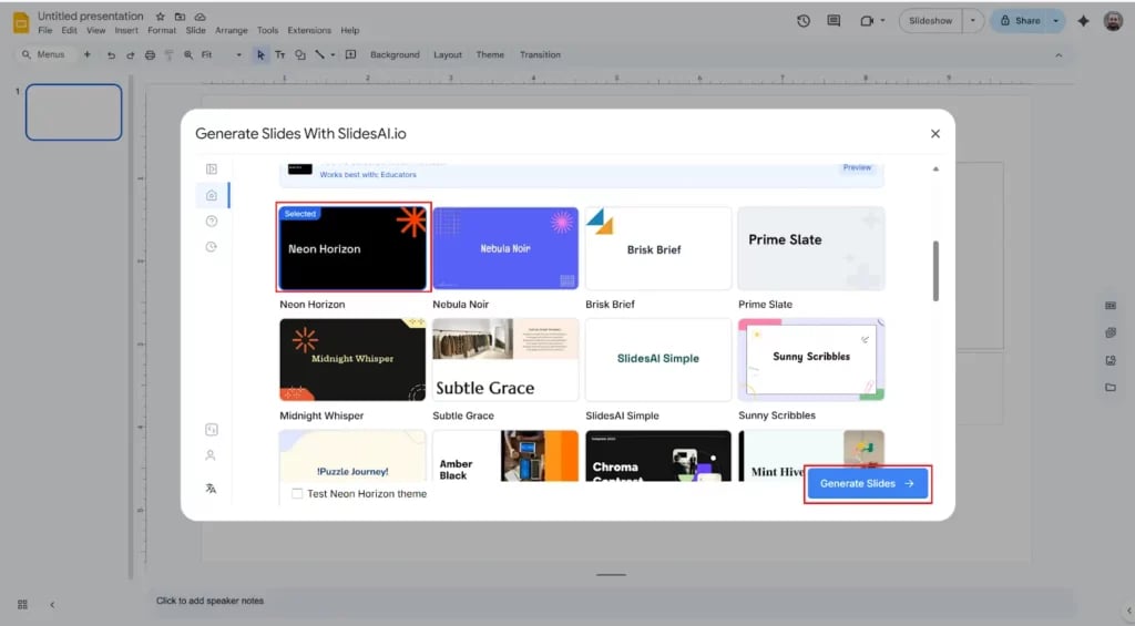 Step 8: Pick a slide design template from the available options and click Generate Slides.