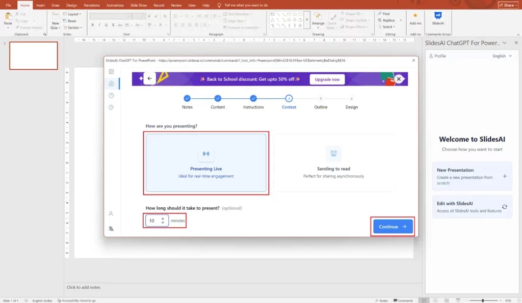 Let SlidesAI know whether this is for a live pitch, webinar, or report, and indicate how long you plan to present.