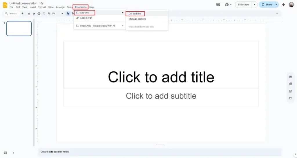Step 1: Install the SlidesAI extension in Google Slides.. Go to Extensions → Add-ons → Get add-ons, search for SlidesAI, and click Install.