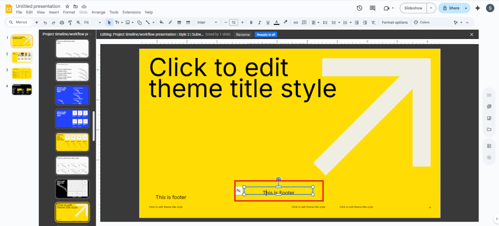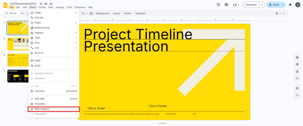 • Google Slides does not offer a built-in footer feature like Google Docs, but you can manually create one using text boxes or the Theme builder.