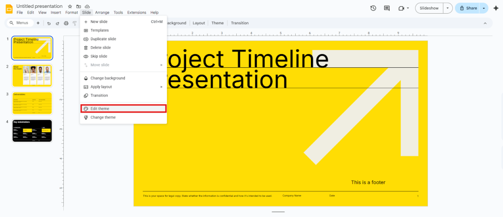 Click on the “Slide” option in the top menu, then select “Edit theme” from the dropdown menu. This opens the master slide view where global design elements are controlled.