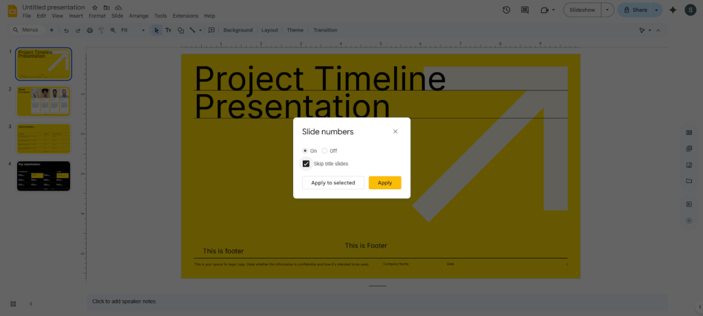 Choose whether to apply numbers to all slides or skip the title slide. Then click “Apply.”
