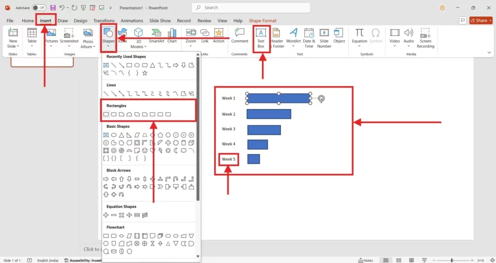 Now go to Insert > Shapes and choose the Rectangle tool. Draw one rectangle (or bar) for each task. The length of the bar should reflect how long the task will take. For example, a task that lasts two weeks should have a bar twice as long as a one-week task.