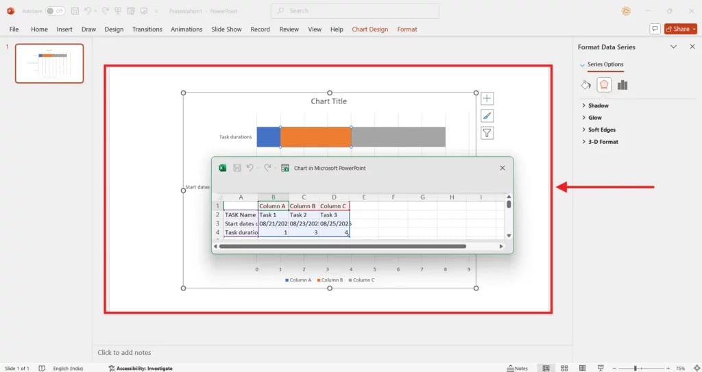 Change the colors of the task bars to make them easier to distinguish. You can also add data labels to show exact durations or start dates. These small details make your chart more informative and polished.