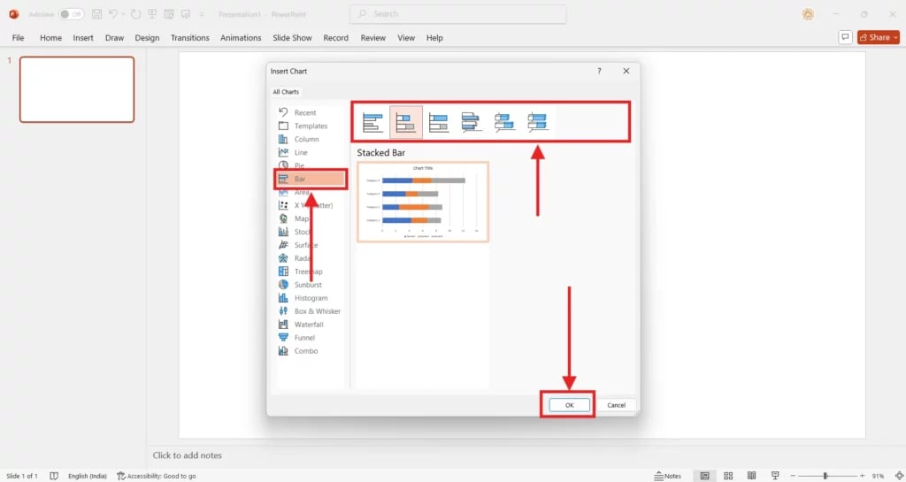 Go to Insert > Chart > Bar > Stacked Bar. PowerPoint will open an embedded Excel sheet alongside your chart.