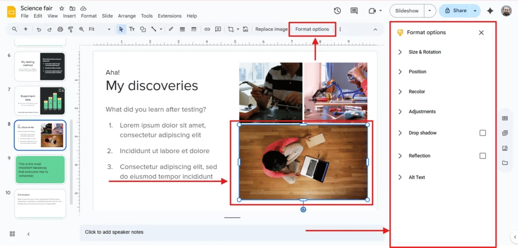 - If your image isn’t already on the slide, copy it (Ctrl + C) and paste it into your Google Slides presentation (Ctrl + V).