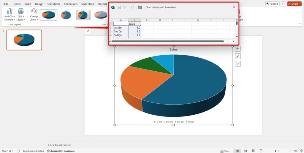 A small Excel window will appear with default values. Replace those values with your own categories and numbers. The pie chart on your slide will update automatically as you type. Once done, just close the spreadsheet.