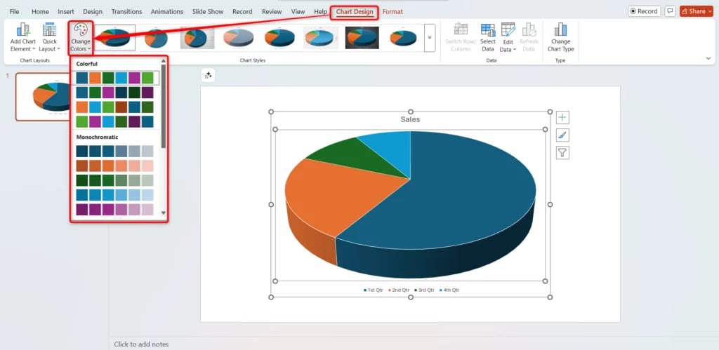 - Change Colors: Click on the chart, go to the Chart Design tab, and click Change Colors to try different color combinations.