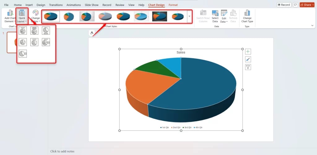 - Apply Styles: Explore Quick Layouts and Chart Styles under the Chart Design tab for a fast and polished look.