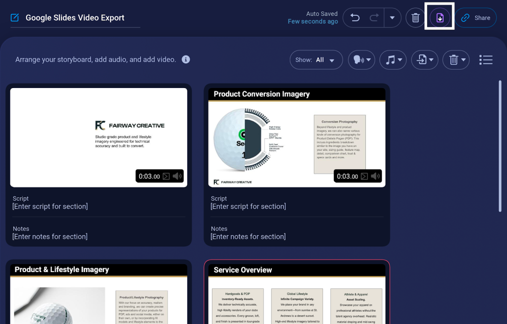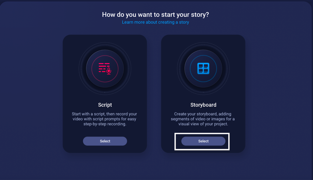 Step 1 – Prepare and Import Slides: Save your Google Slides as a PDF. Open ScreenPal’s desktop app or web editor, start a new project, and select “Storyboard”.