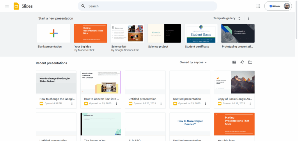 You’ll appreciate its diverse selection of templates, slide transitions, multimedia embedding options, and quick and easy creation of stunning presentations. And, if you value cloud-based solutions and seamless integration with other add-ons like SlidesAI, then Google Slides is the perfect ally for you.