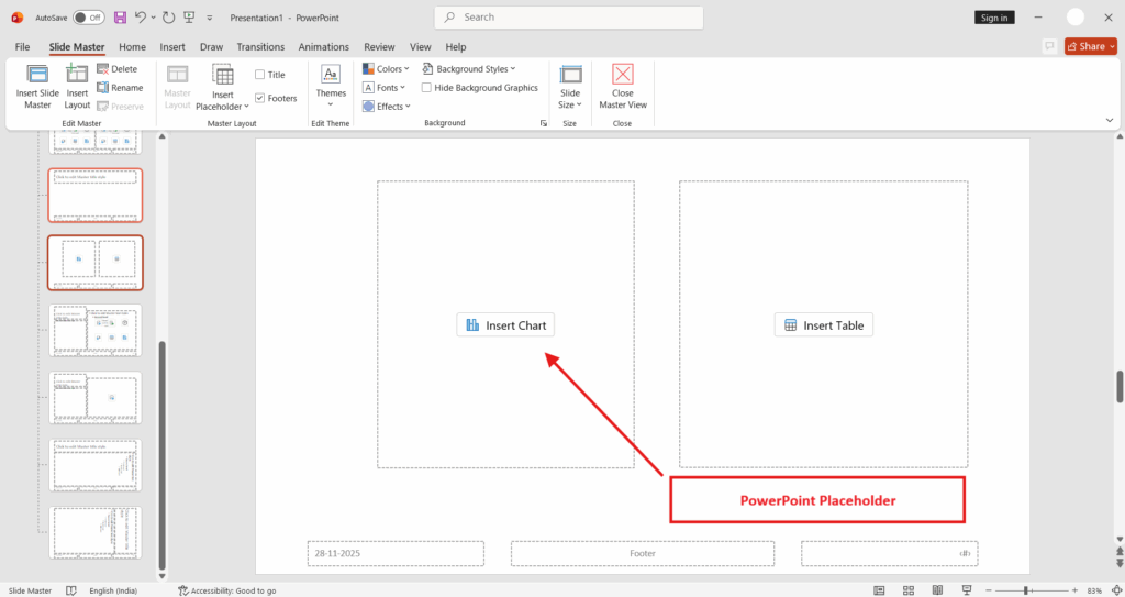 Now, focus on adding placeholders to the slide layout. Initiate this action by pressing the “Insert Placeholder” button in the “Slide Master” ribbon’s menu. Choose the desired placeholder type from the dropdown menu and define its size by dragging the cursor on the slide. Upon completion, click anywhere on the slide to finalize the placement. Repeat this process as needed to incorporate additional placeholders.